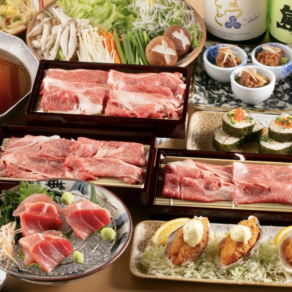 厳選本マグロ御造りと知多牛と桜鯛の合わせ技しゃぶしゃぶ鍋が入った宴会コースです。お料理はもちろん、全国からの選りすぐり日本酒多数などドリンクも充実しております◎
